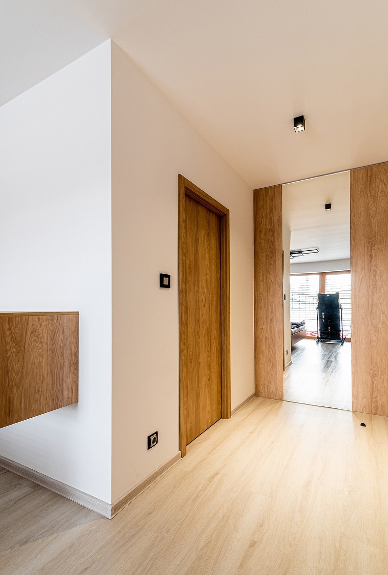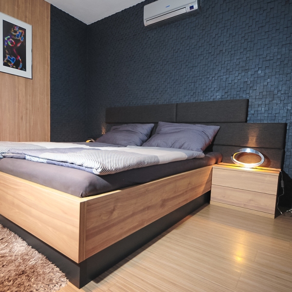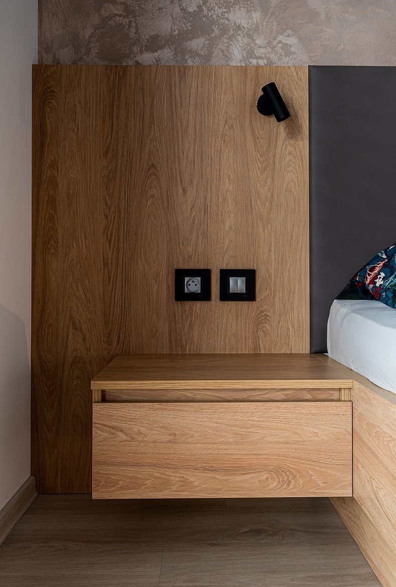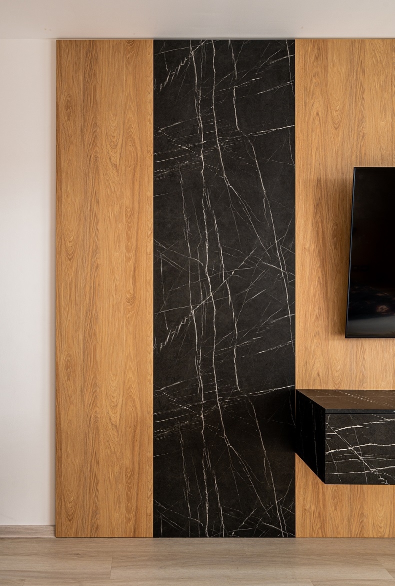 Ložnice s obložením v imitací mramoru a přírodním dubu do kterého jsme zakomponovali TV, komodu a velké zrcadlo.