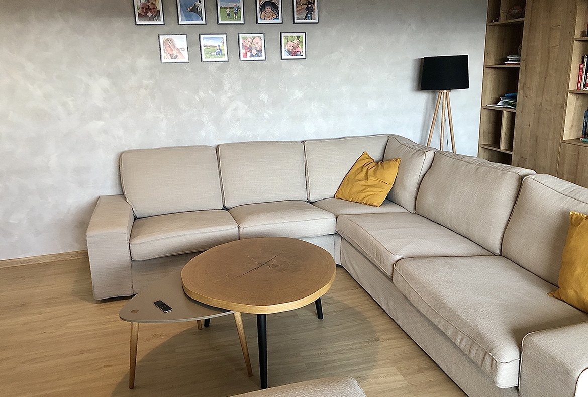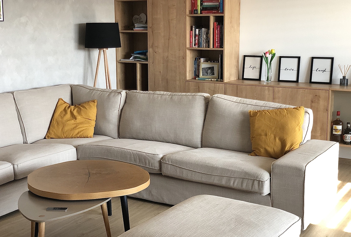 Obývací pokoj s knihovnou a barem