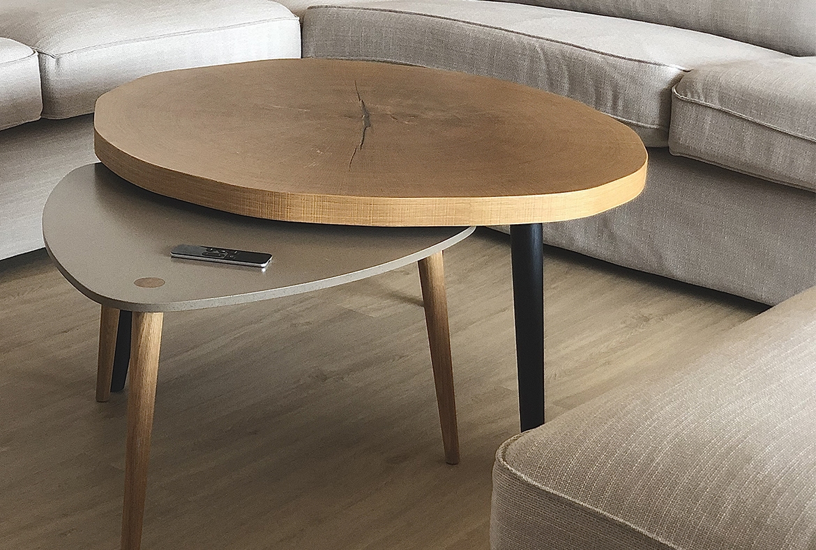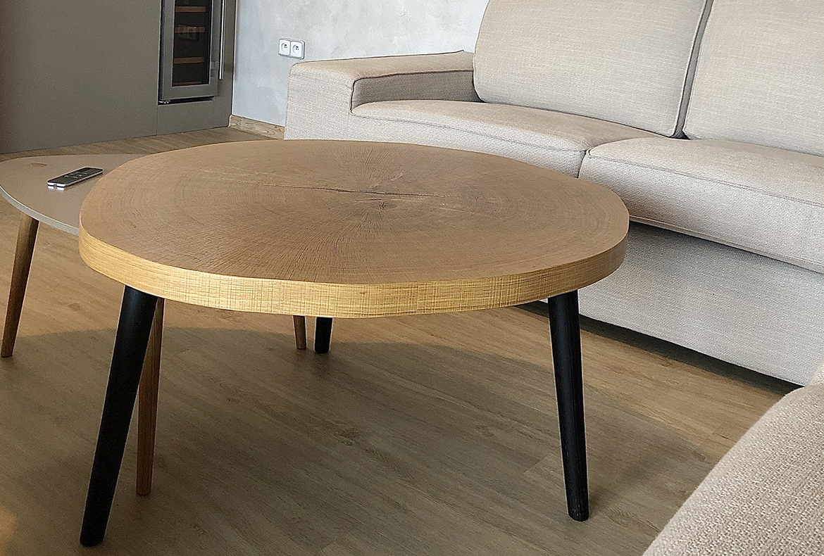 Obývací pokoj s knihovnou a proskleným barem v dubu Hamilton.
