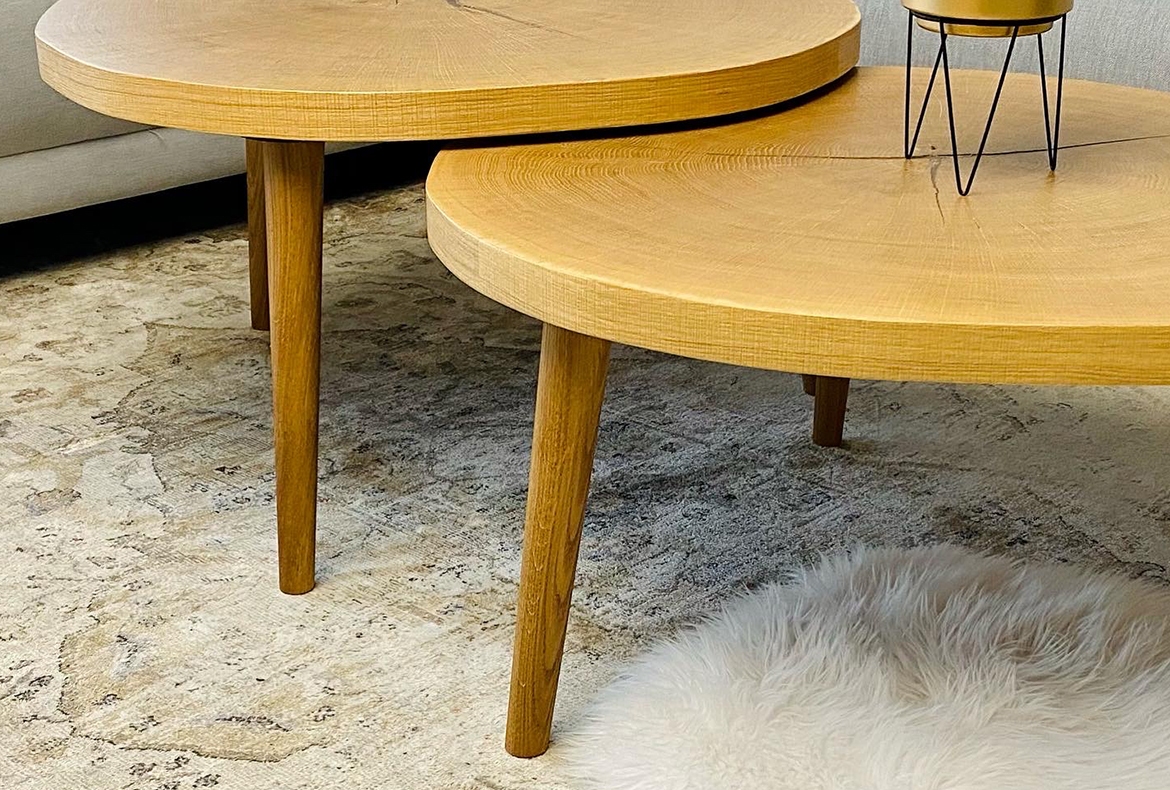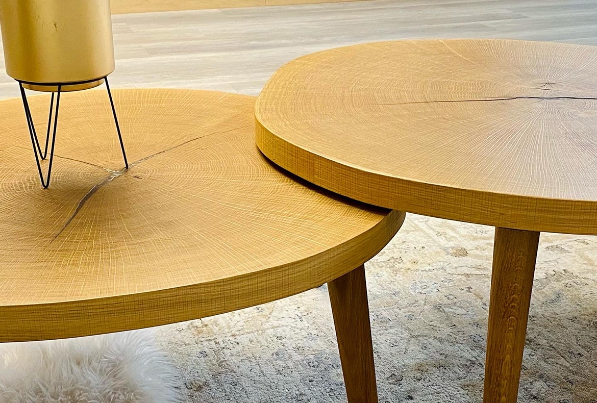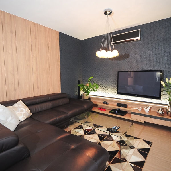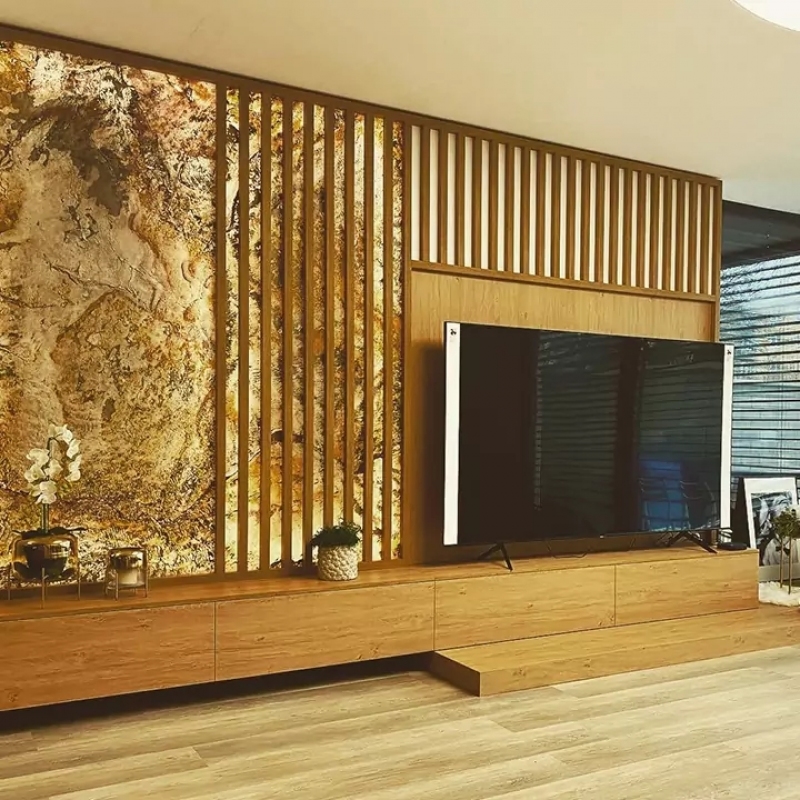 Velký obývací pokoj v přírodním dubu, rastrem a kamennou dýhou. Součástí je také prostor pro květiny, nebo vánoční stromeček.