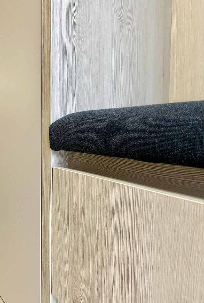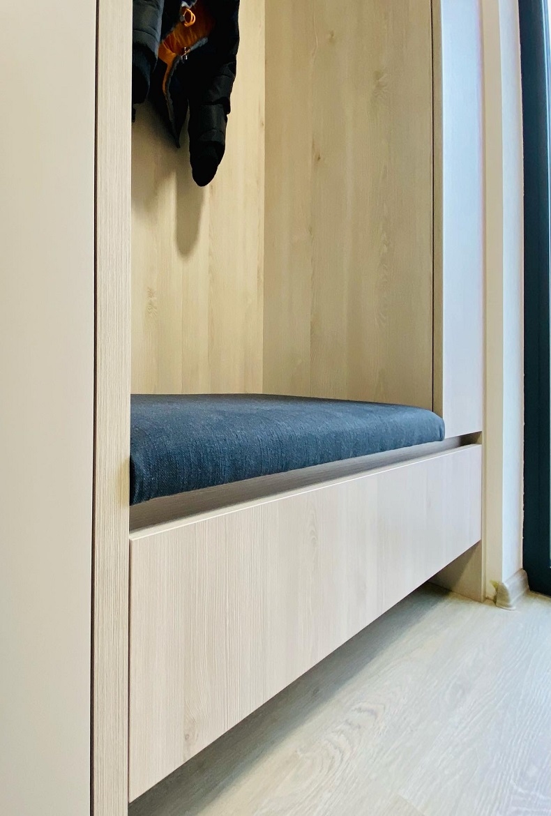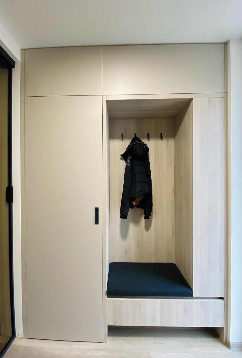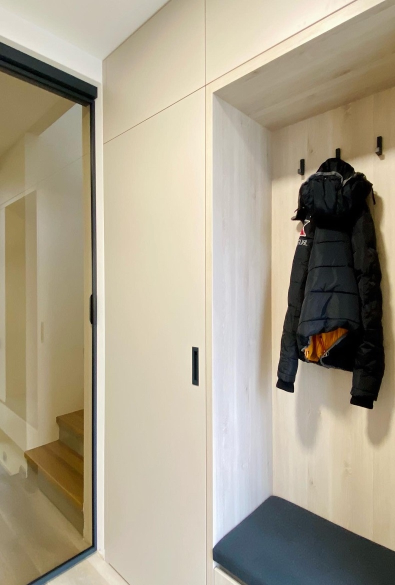 Jednoduchá předsíň v bílém lesku a dubové dýze. Součástí skříně jsou velké zrcadla.