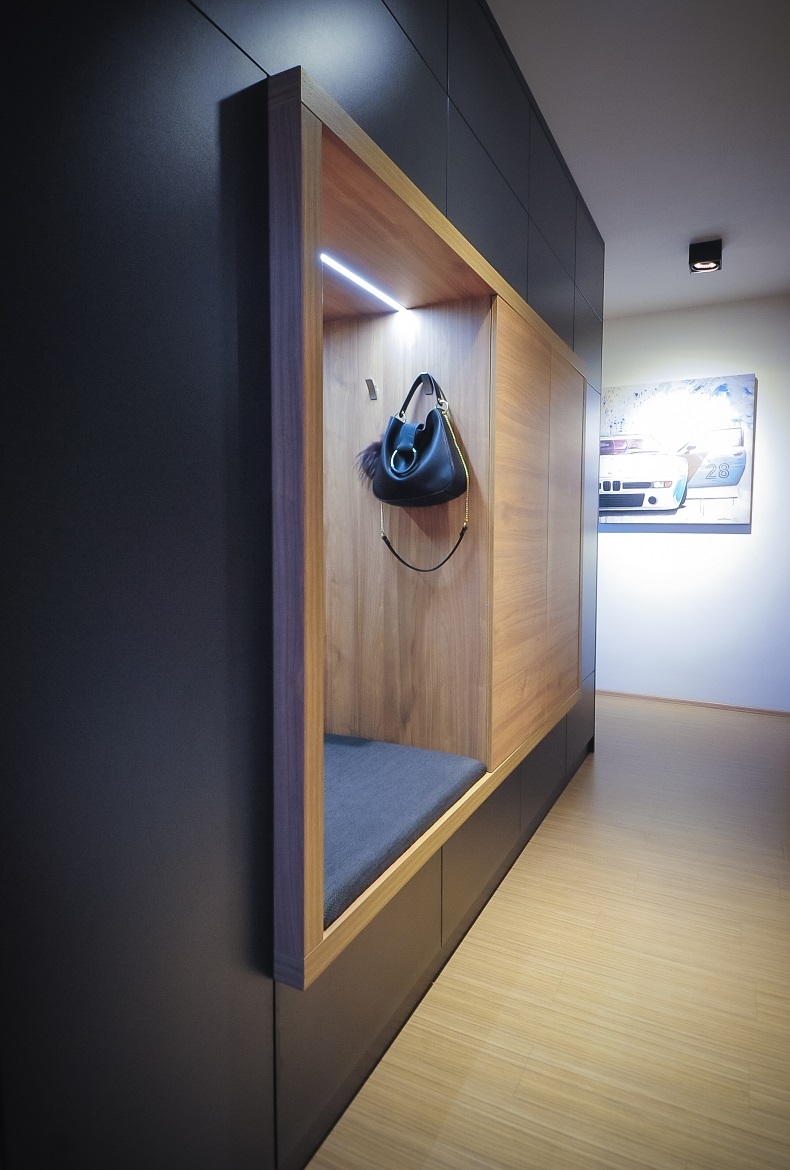 Vestavná skříň s velkým úložným prostorem a místem k sezení vytváří jednotný a elegantní vzhled.
