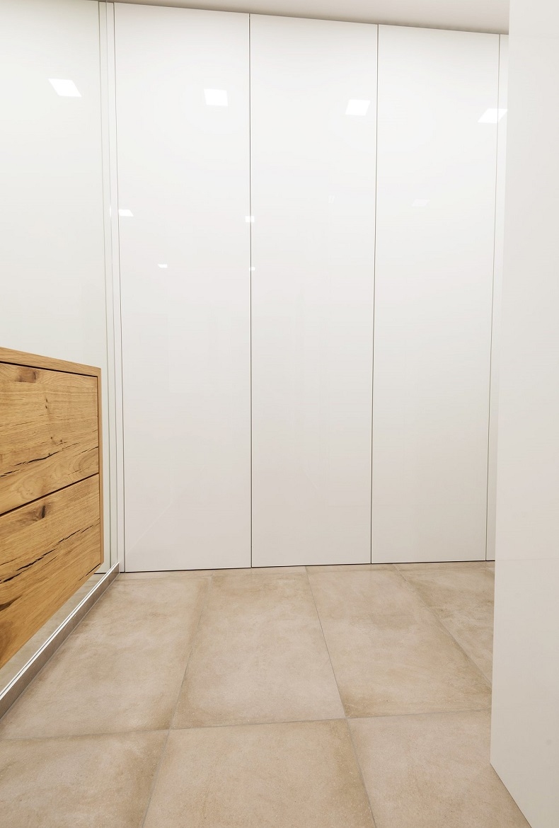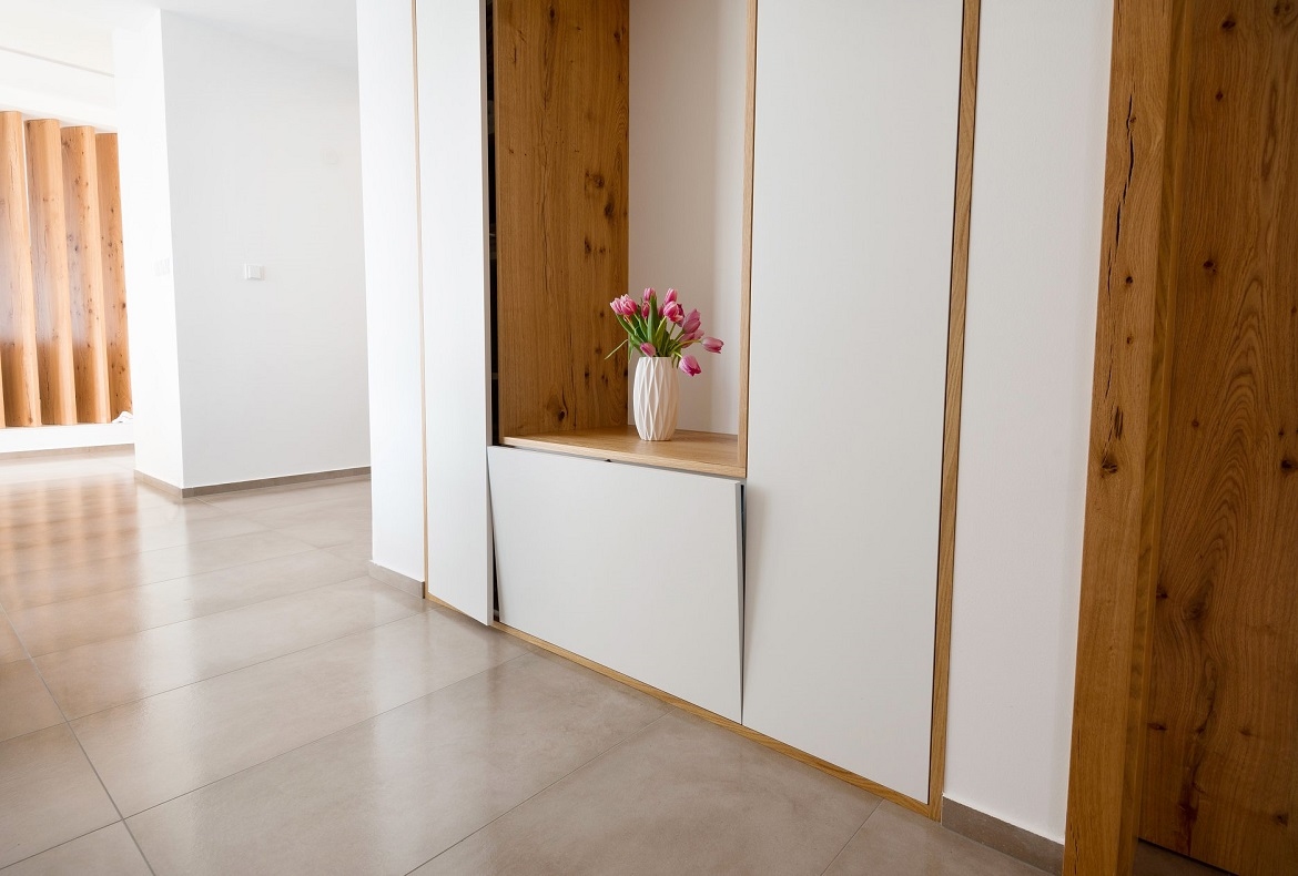 Jednoduchá předsíň s vestavěnými skříněmi a komodou ozvláštněná praskaným dubem.