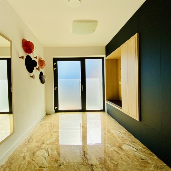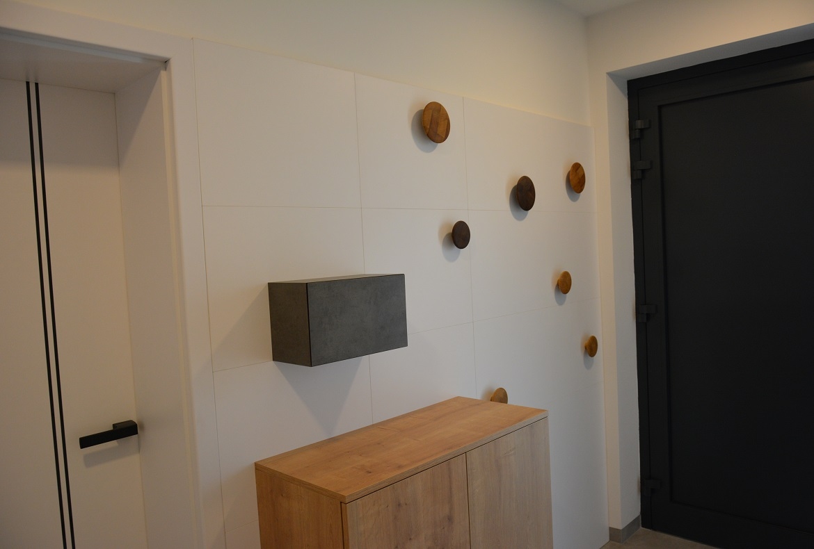 Vzdušná předsíň s vestavnou skříní, komodou a designovými kulatými věšáky.