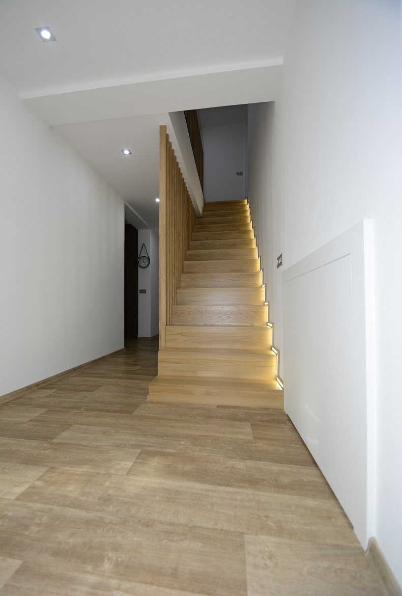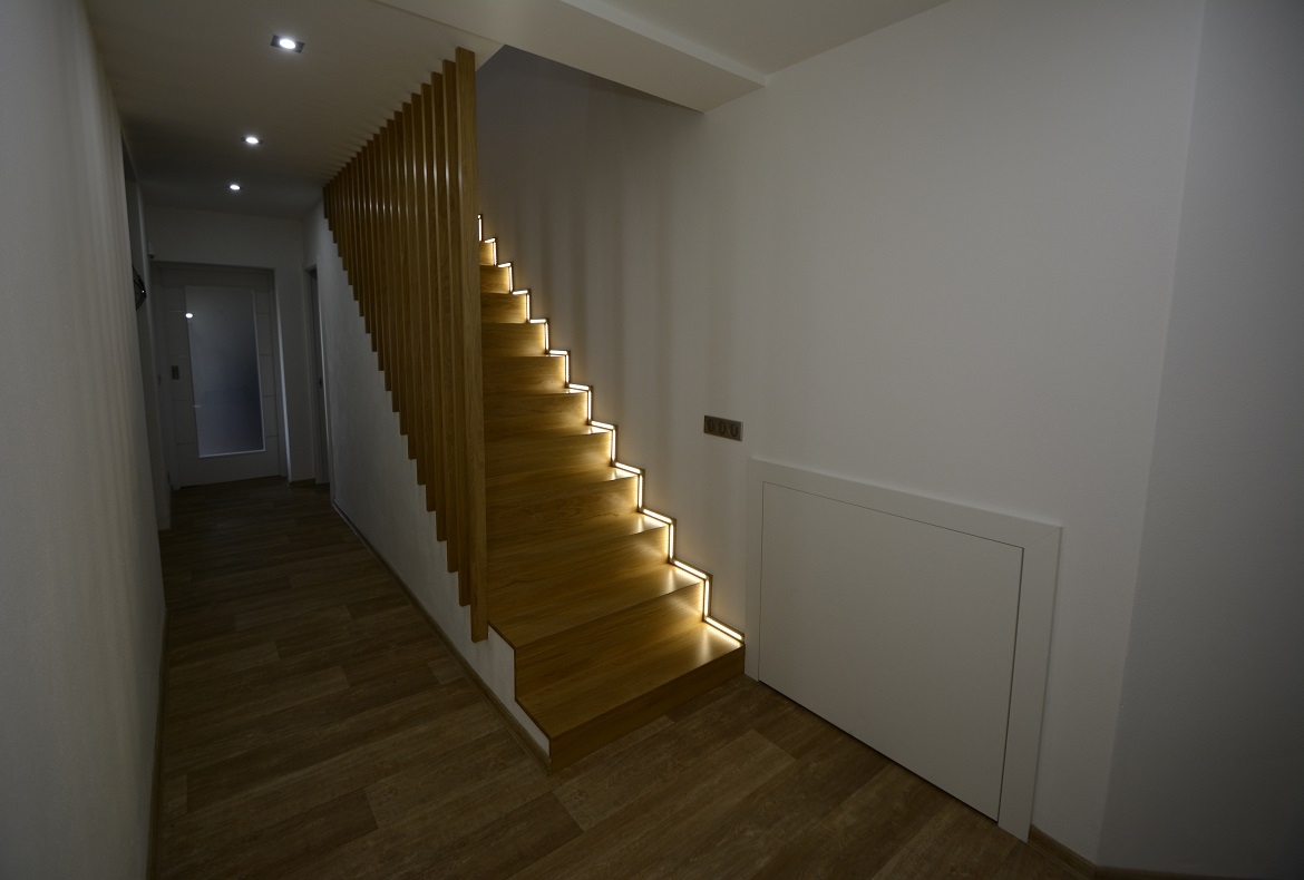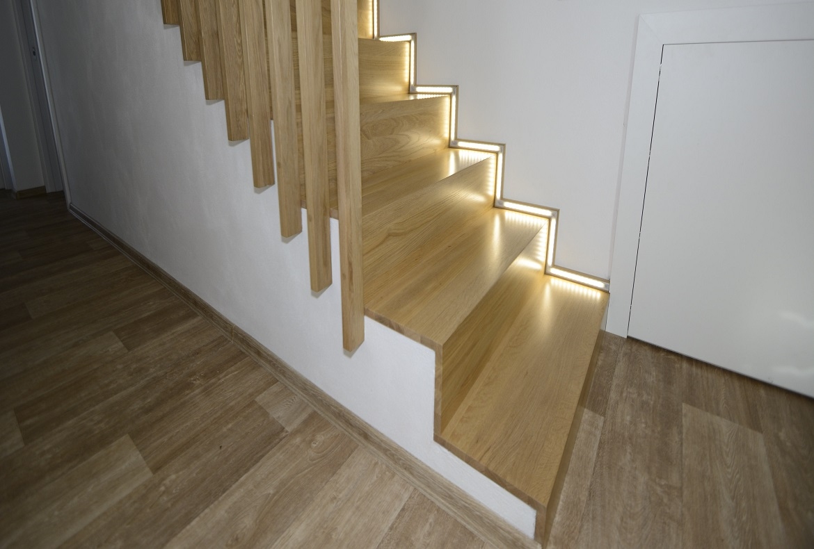 Moderní dubové Schodiště s rastrem a led osvětlením.