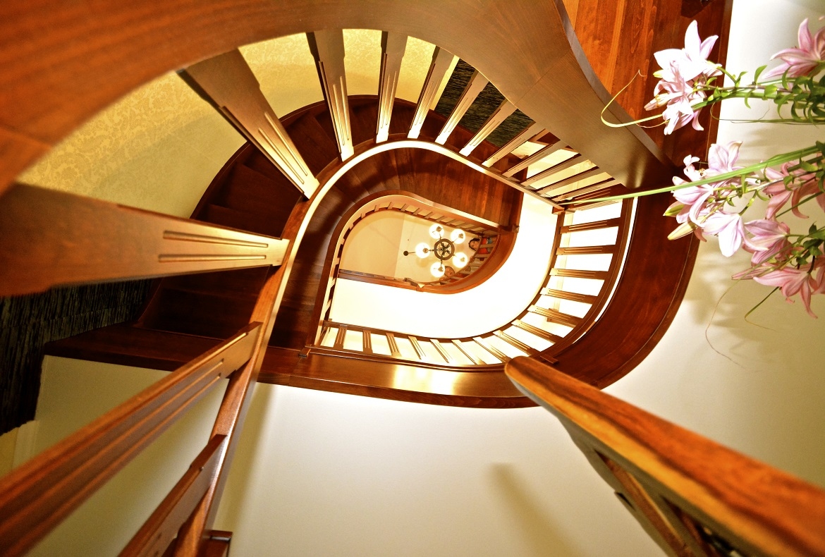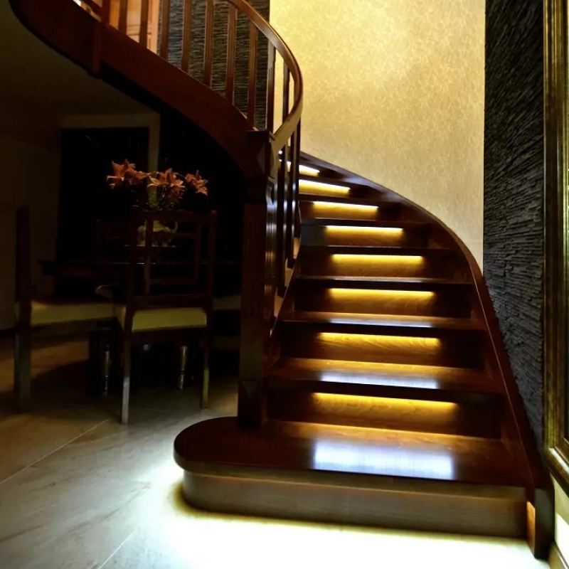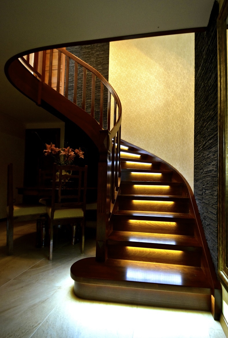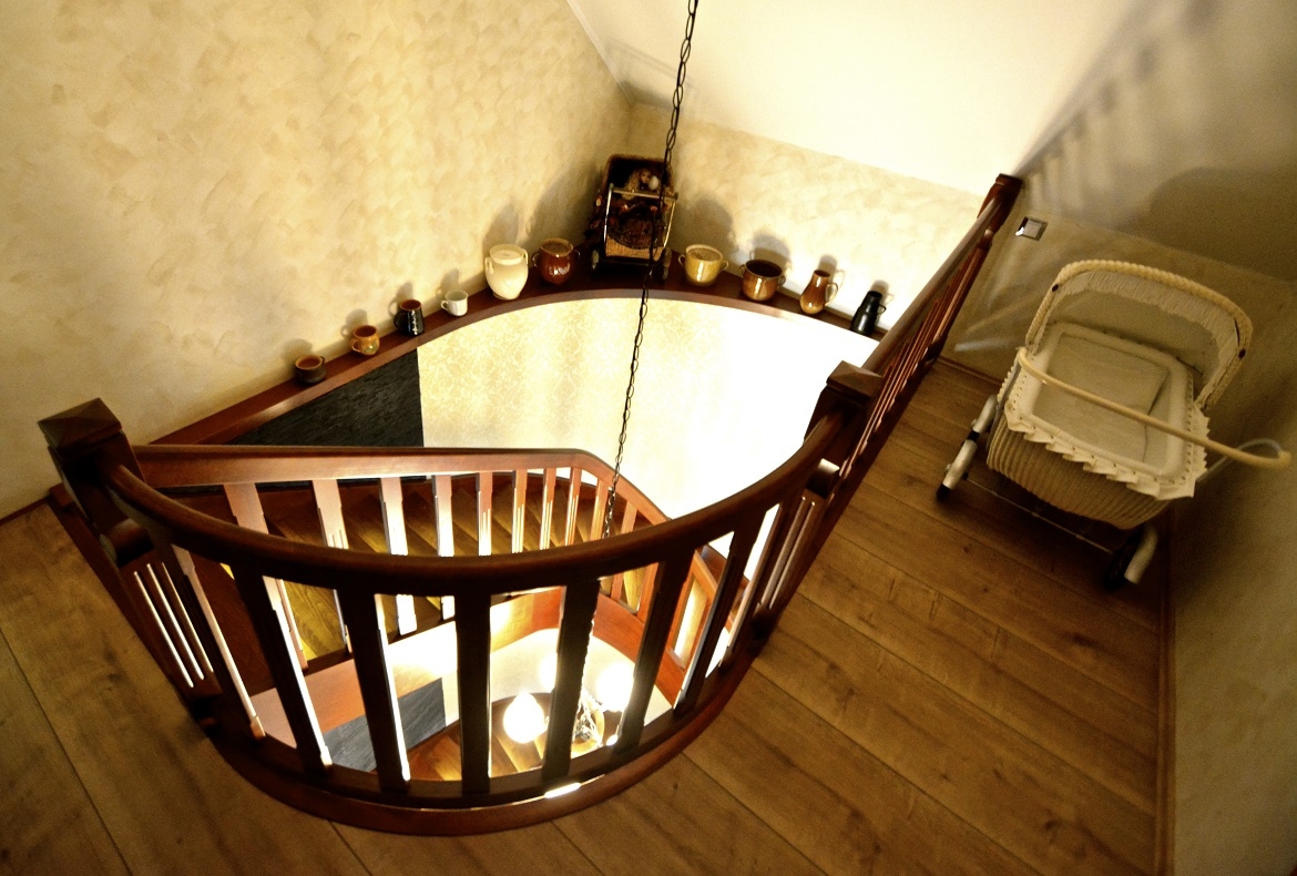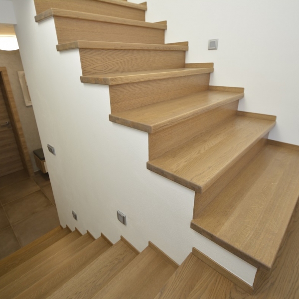 Samonosné schodiště byla výzva - je vyrobeno z kvalitního masivního bukového dřeva, dýhy a truhlářské překližky. Povrchovou úpravu tvoří moření a lakování odolným podlahovým lakem s protiskluzným atestem. Každý nášlap je osvětlen led páskem a celé schodiště je napojeno na stmívající čidlo, které automaticky řídí osvětlení schodiště.