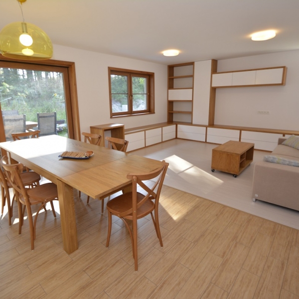 Jídelní část s obložením stěny a rozkládacím jídelním stolem na míru až pro 10 osob.