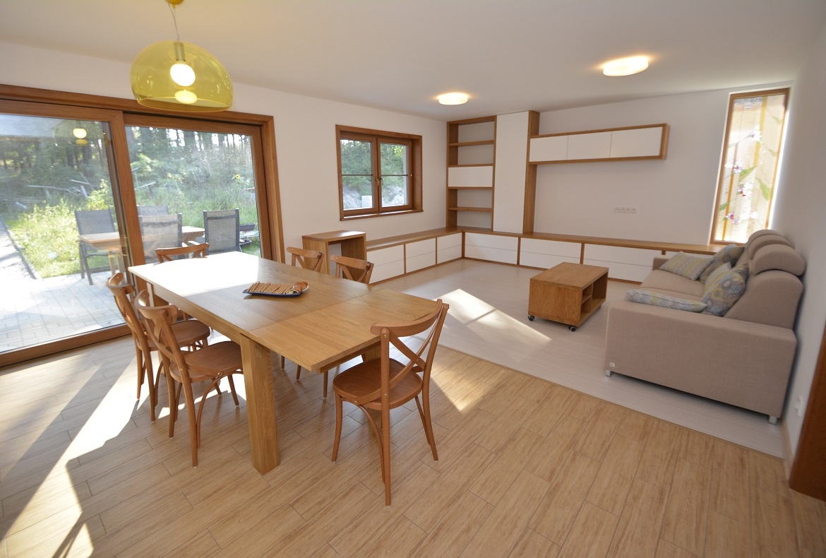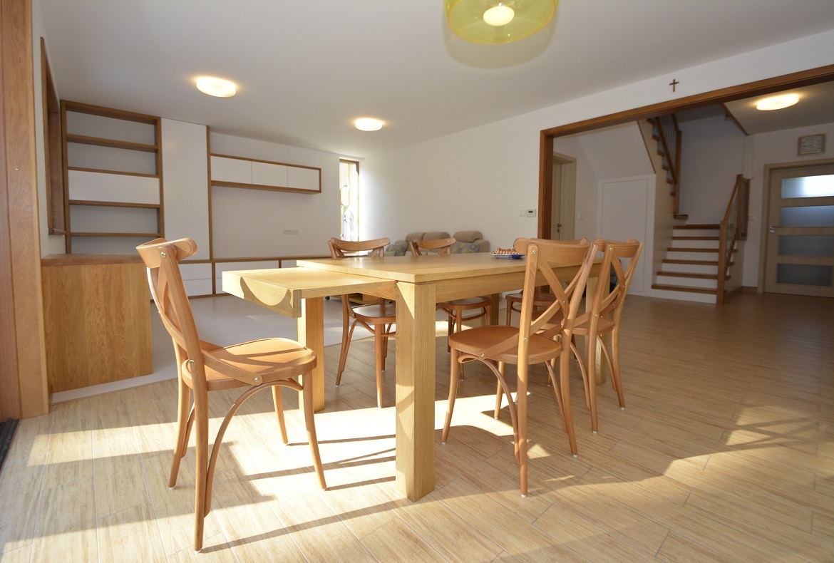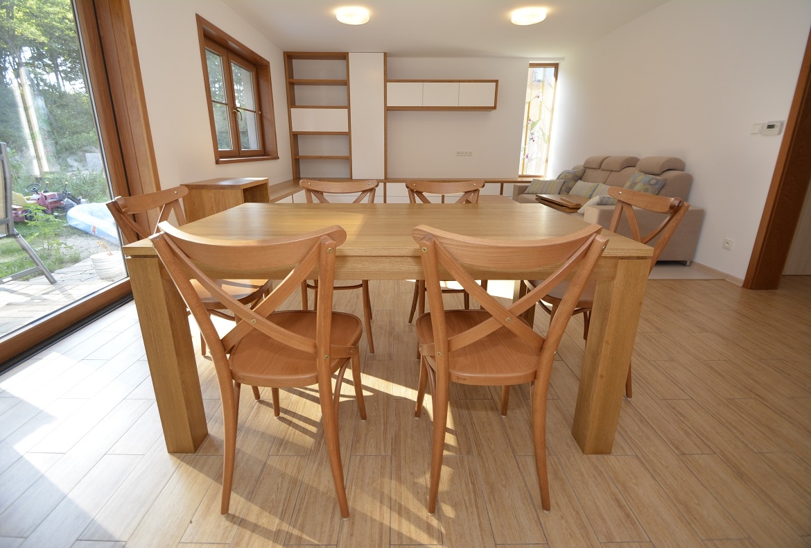 Jídelna s TV sestavou v masivním dubu s bílým matným lakem vytváří útulný, domácí interiér. Jídelní židle od firmy TON 150.