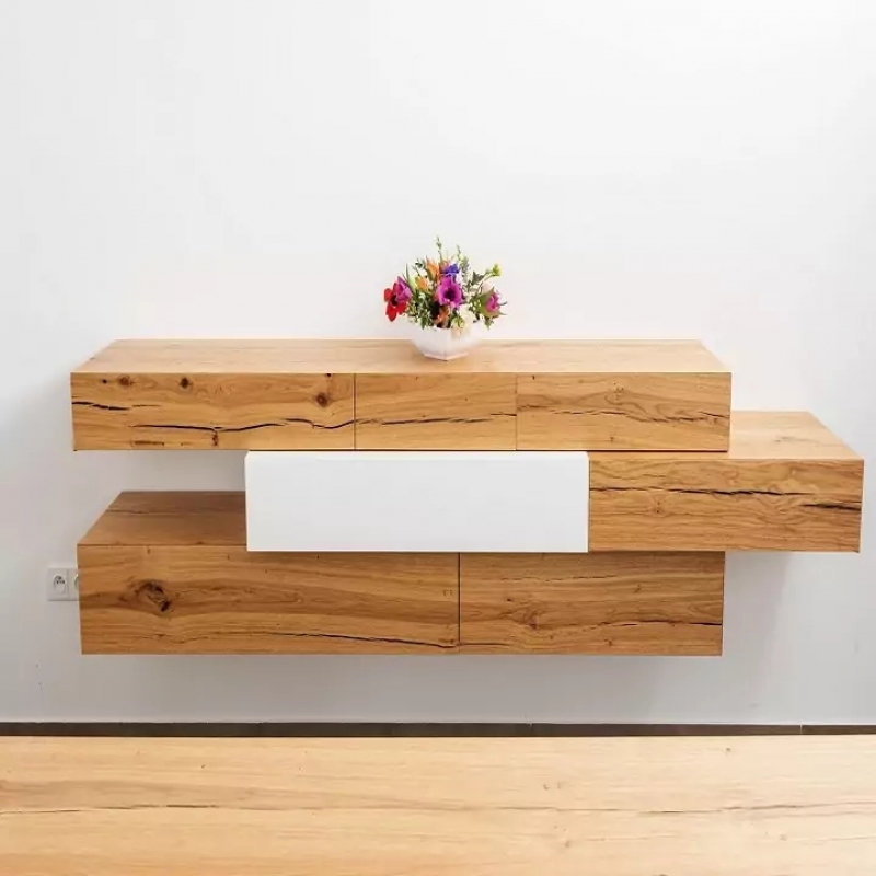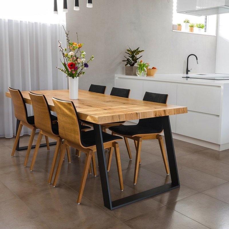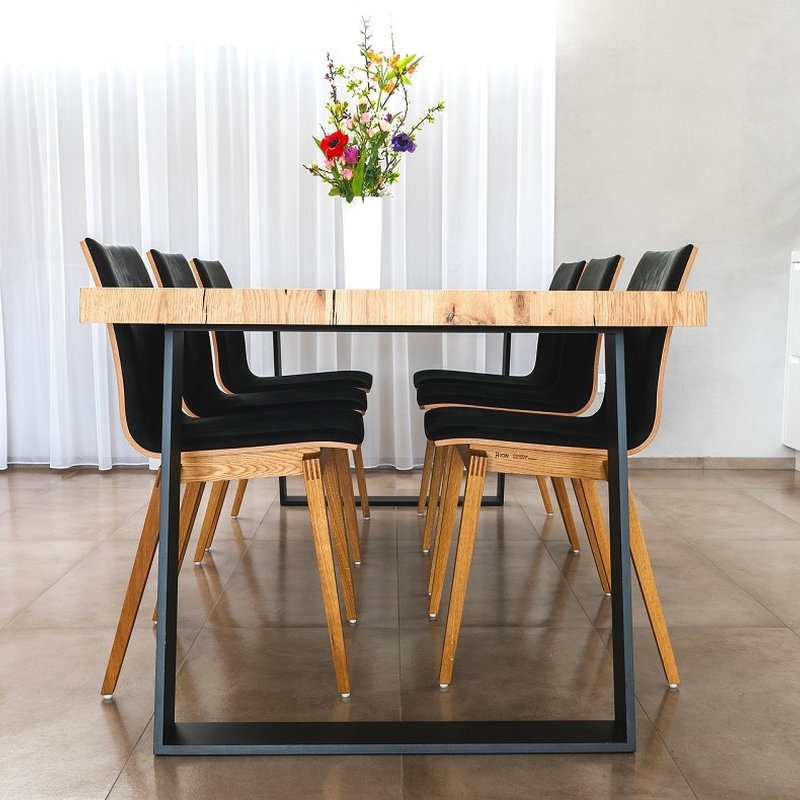Jednoduchá nadčasová jídelna s naším jídelním stolem v praskaném dubu a designovou komodou. Doplněná o židle TON Stockholm.