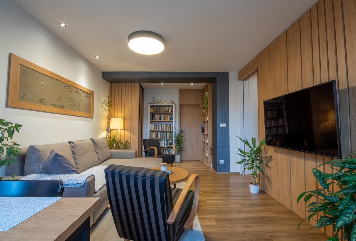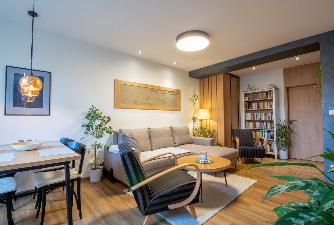 Kompletní útulný interiér bytu s retro kousky nábytku. Místo realizace: Kyjov