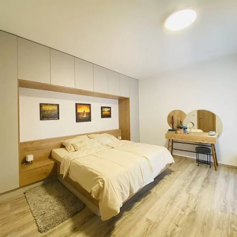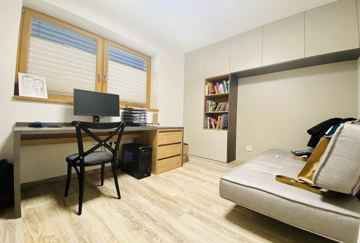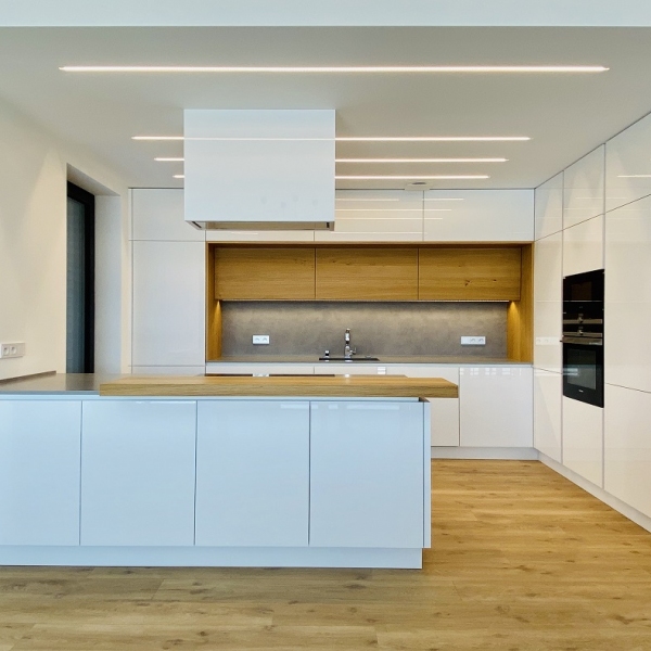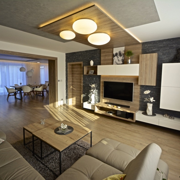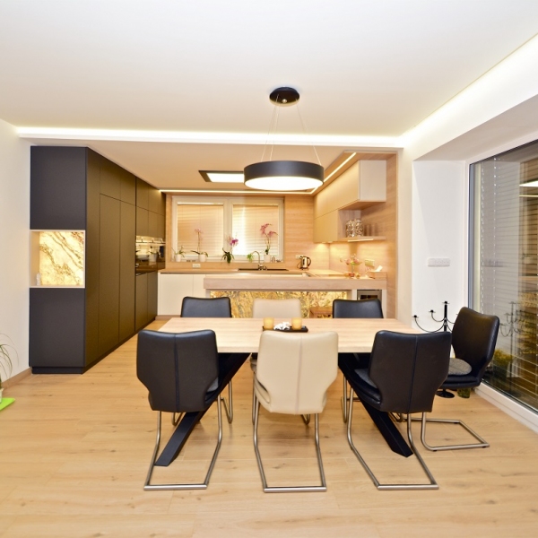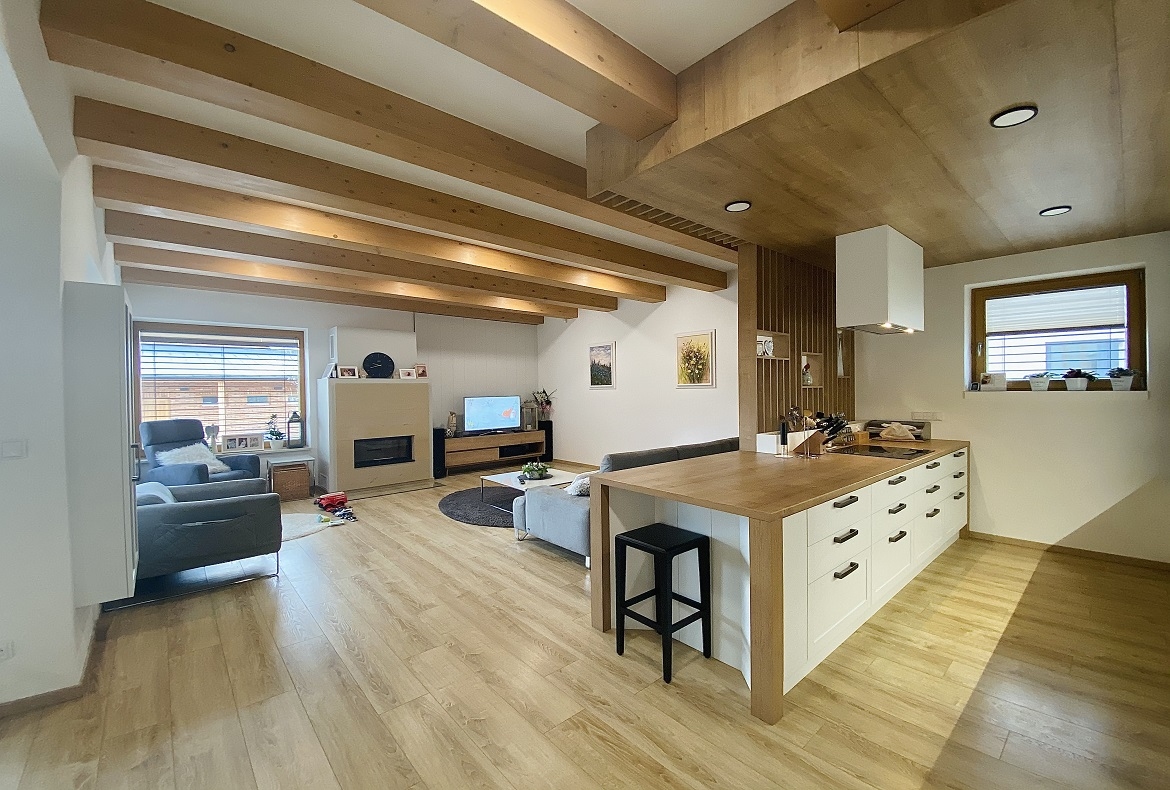 Kompletní interiér v útulném domácím stylu. Zajímavým prvkem je jídelna se zavěšenou lavicí a obložením stěny i stropu.