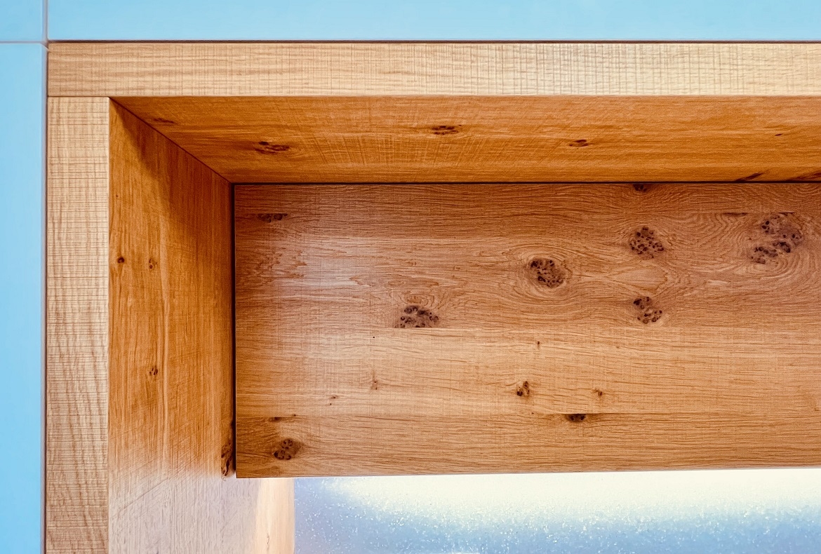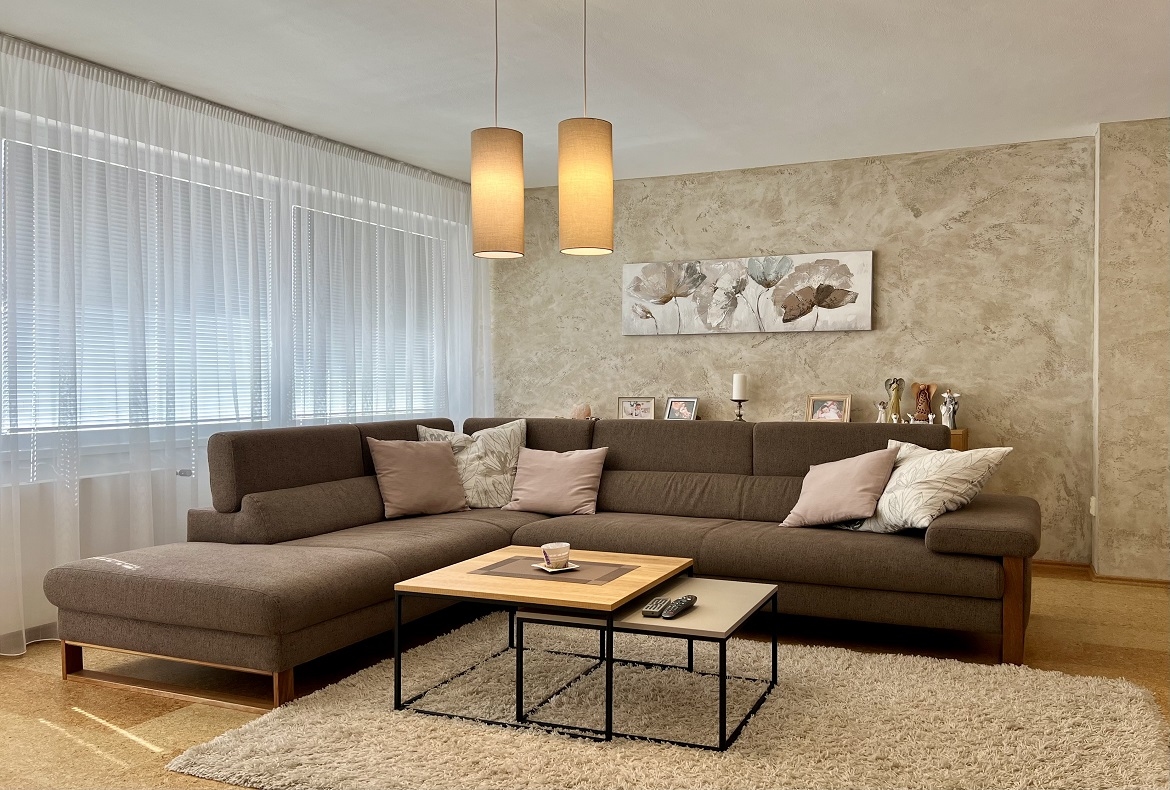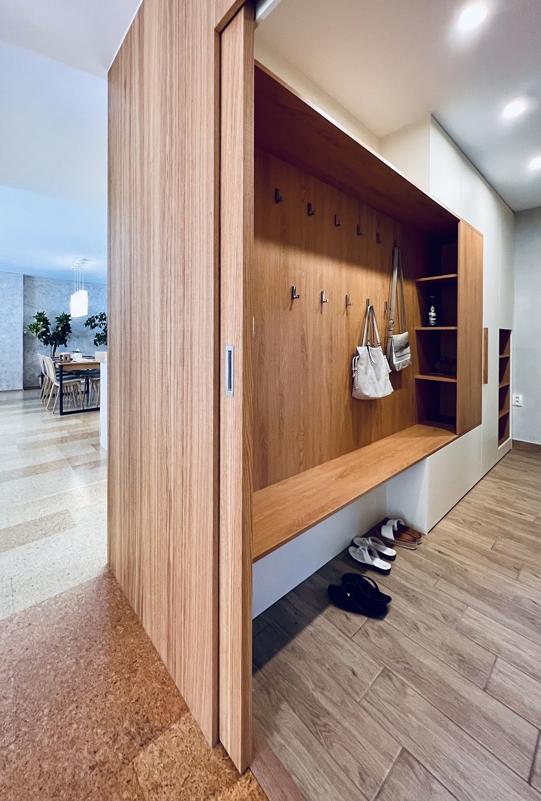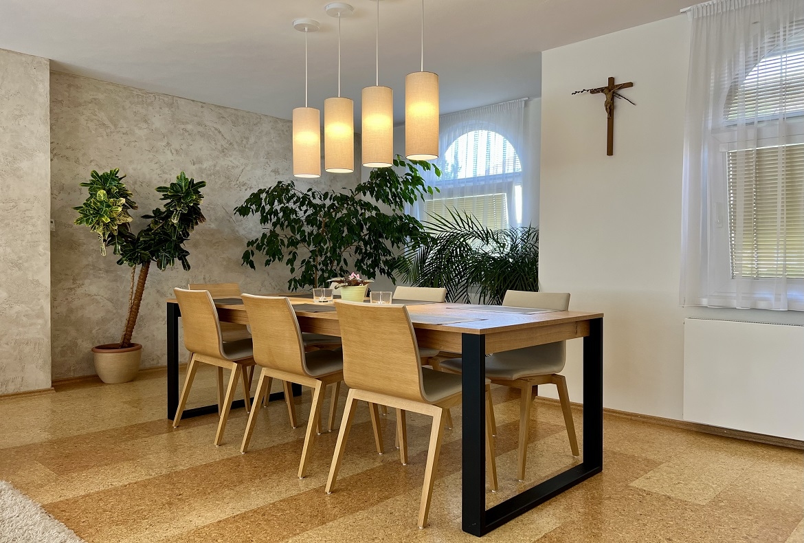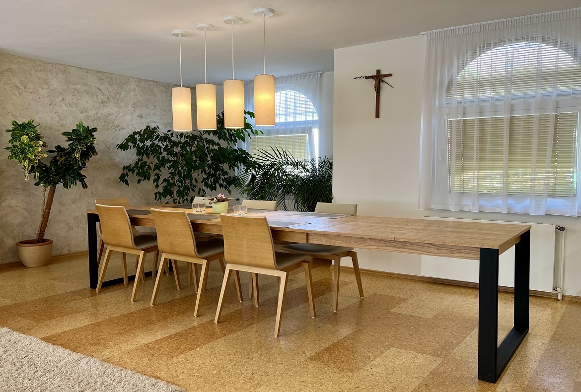 Interiér v přírodních tónech, kde plynule kuchyň navazuje na zádveří. V jídelně je dost prostoru na velký rozkládací stůl MAX.
