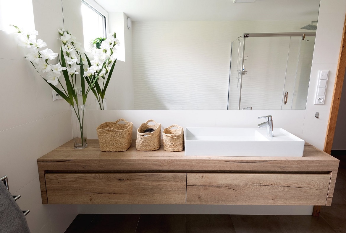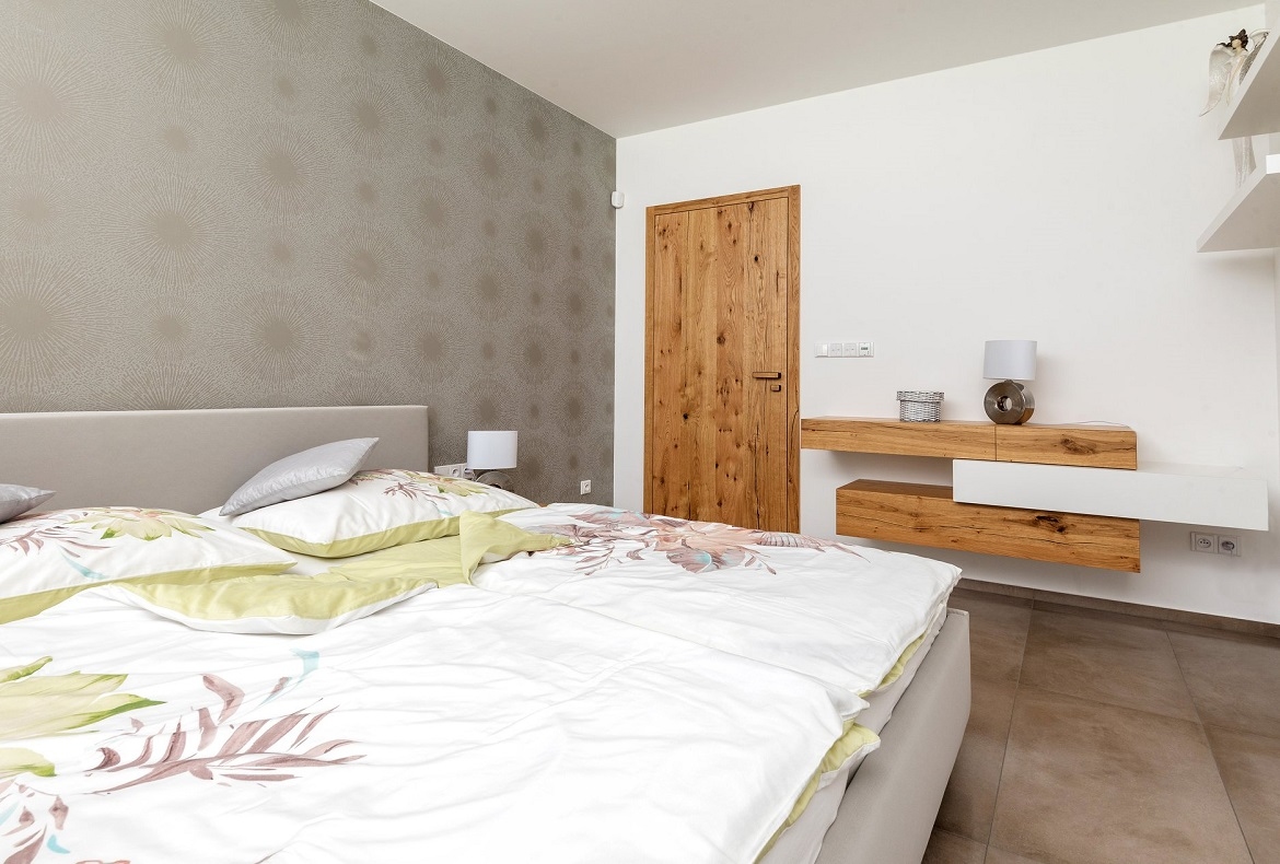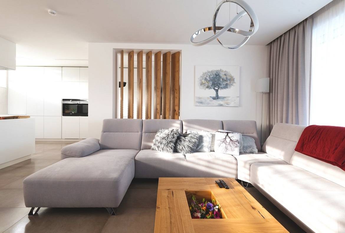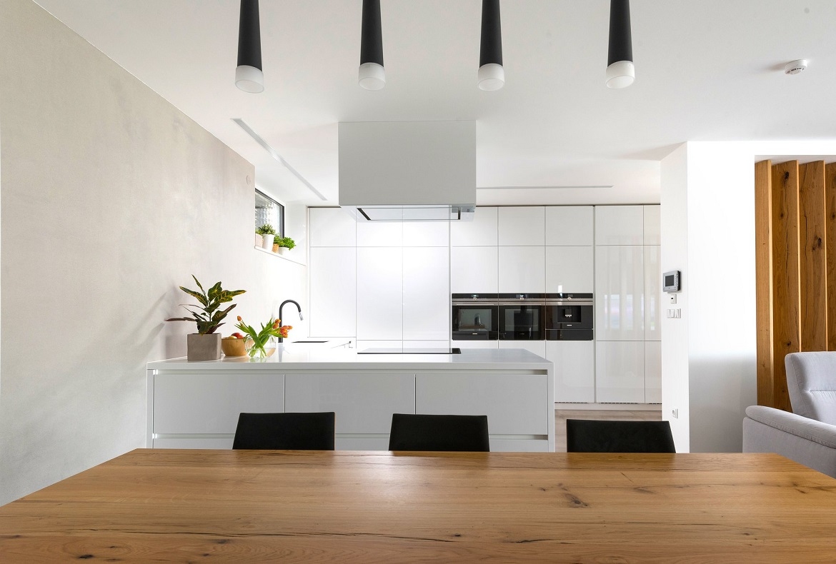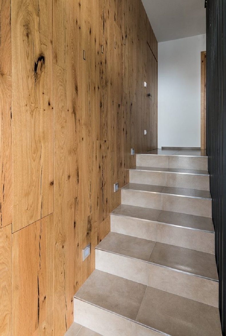 Originální nadčasový kompletní interiér, který nepodléhá trendům. Spojující originální prvek je použitá praskaná dubová dýha.